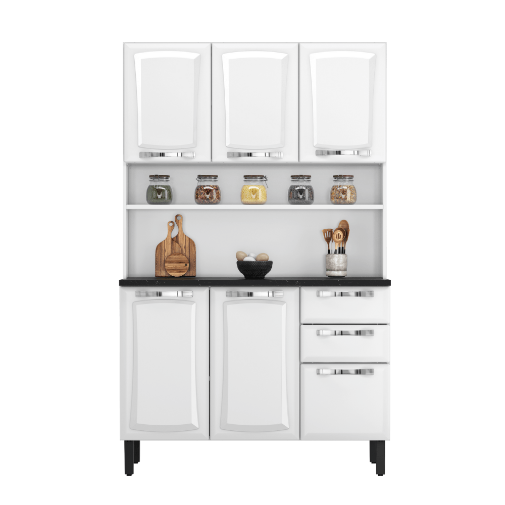Com 6 portas e 2 gavetas, oferece excelente espaço interno para organizar utensílios, mantimentos e diversos itens do dia a dia, mantendo tudo sempre acessível e bem distribuído.